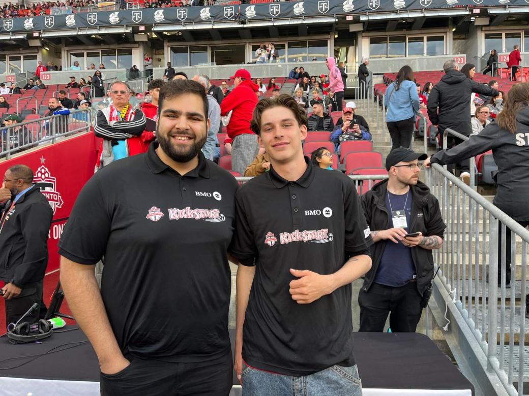 Program Coordinator Tristan Sharma (Left) and Senior Program Leader Asher Whelpley (Right) pitch side at BMO Field.